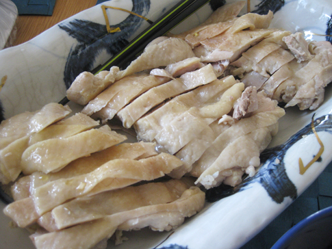 - 氷水に鶏肉を入れて一気に冷やす(これが鶏肉をしっとりさせるらしい。)