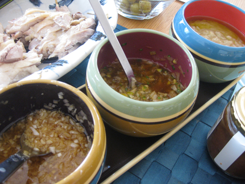 後は薬味。私は塩・生姜の摩り下ろし・ごま油・醤油少々にチキンの茹で汁をひとさじ入れてます。