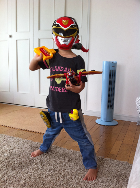 暑い暑いと言いながら、800円もしたお祭りで買ってあげたゴセイレッドのお面をしてありとあらゆる武器を実装して、何かと戦ってます。