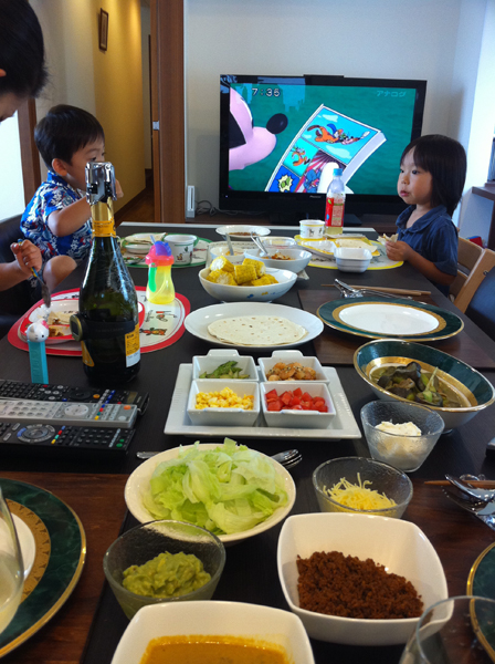 今回はMっち宅。いつもきれいでテーブルセットも完璧。今回は具材もりだくさんのタコス。どうしても包み系は中身を多く入れる傾向あり。。w
